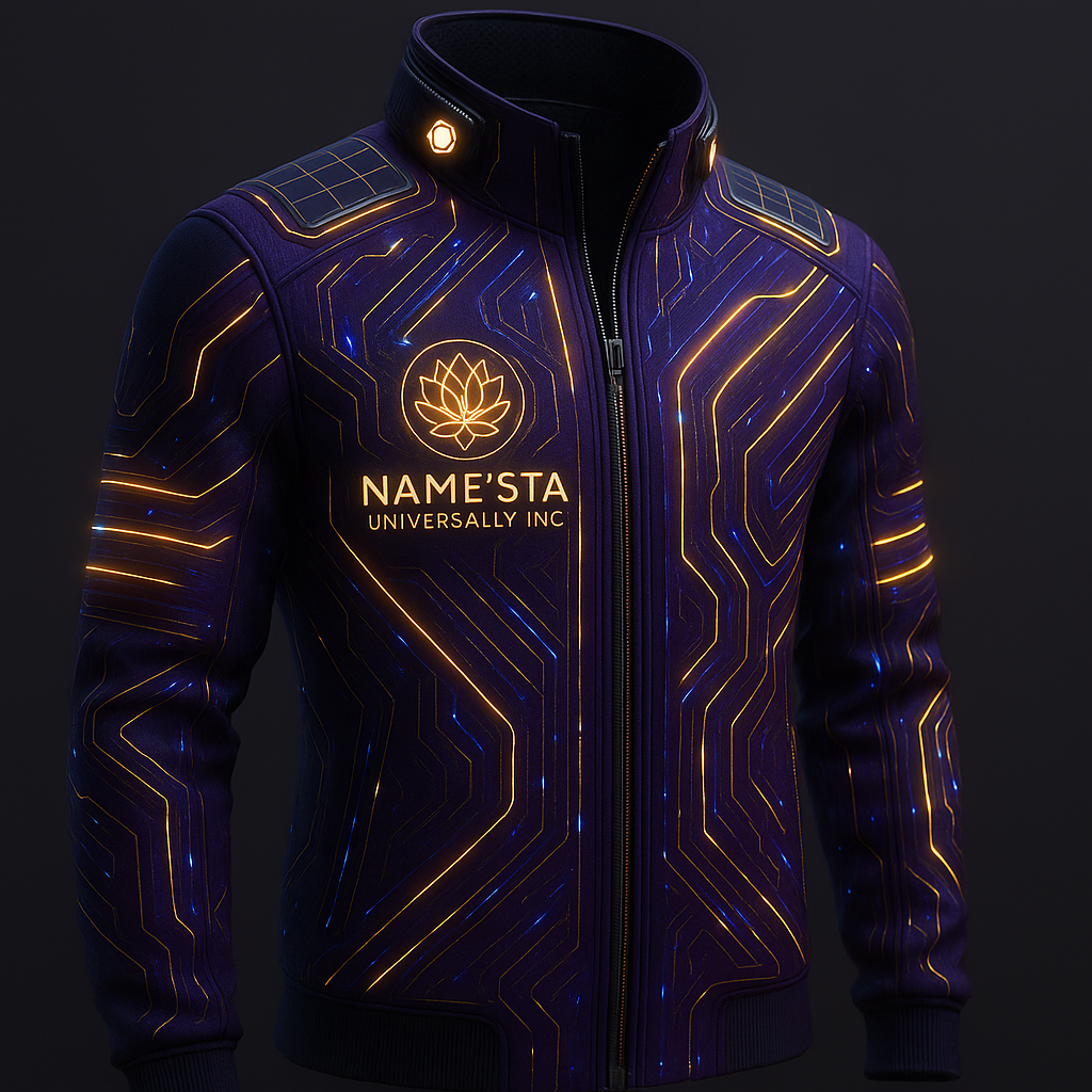Developed by Michelle Ann Flores Martinez™®© and Name’sta Universally Inc.™®©, this first-of-its-kind garment merges emotional AI, biometric sensing, and dimensional navigation into a wearable interface that adapts to your state of being in real time.